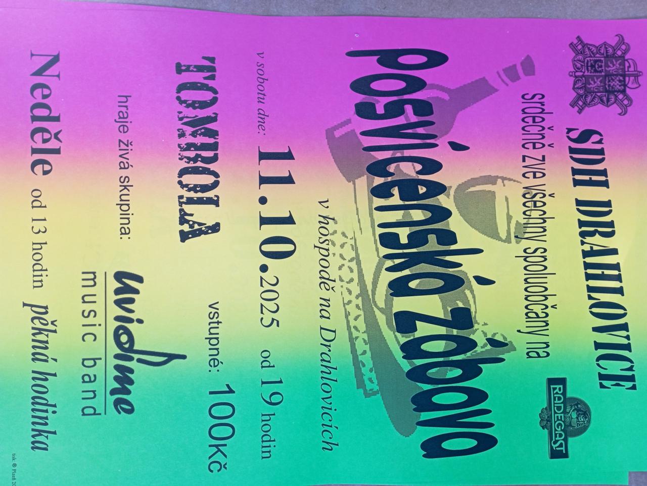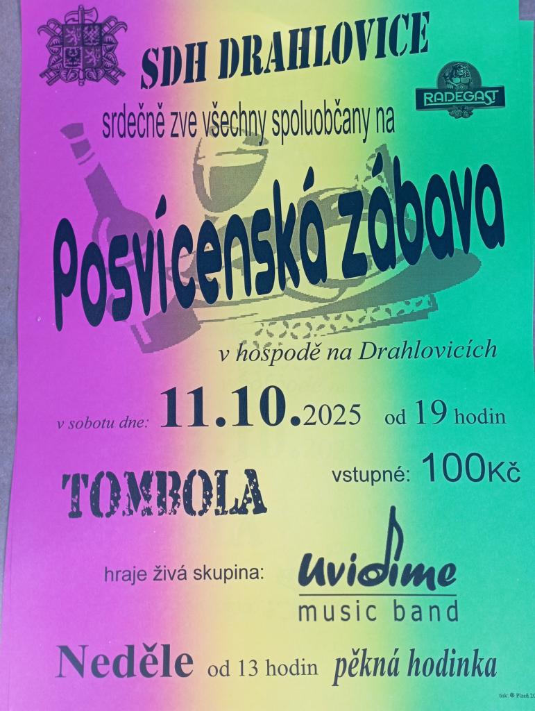 SDH Drahlovice zve všechny spoluobčany na posvícenskou zábavu. V sobotu 11.10.2025 od 19:00.