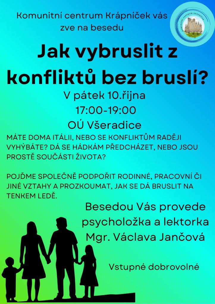 Komunitní centrum Krápníček vás zve na besedu "Jak vybruslit z konfliktů bez bruslí?". V pátek 10. října 17:00 - 19:00 OÚ Všeradice.